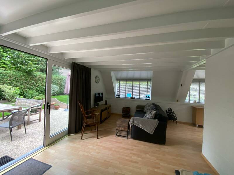 Woonkamer met eettafel en vijf stoelen. Zit/ slaapbank, comfortabele lekker zittende Windsor stoel en salontafel. Televisie.
