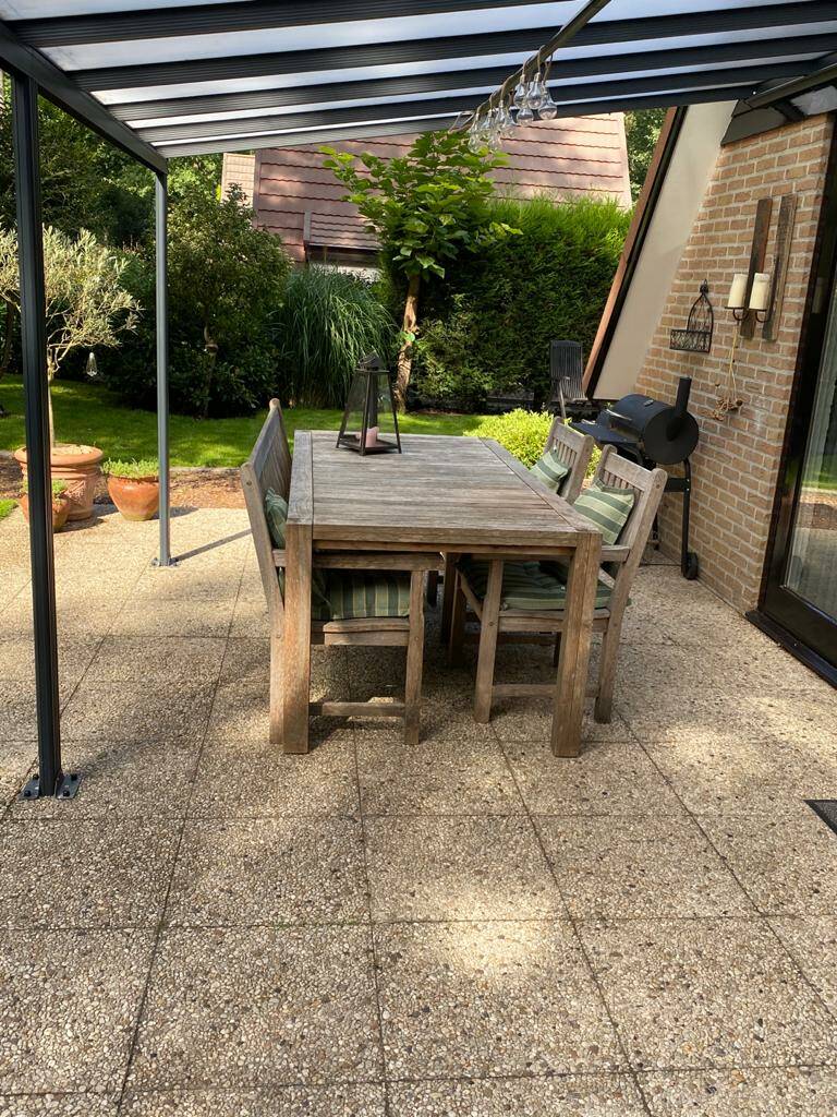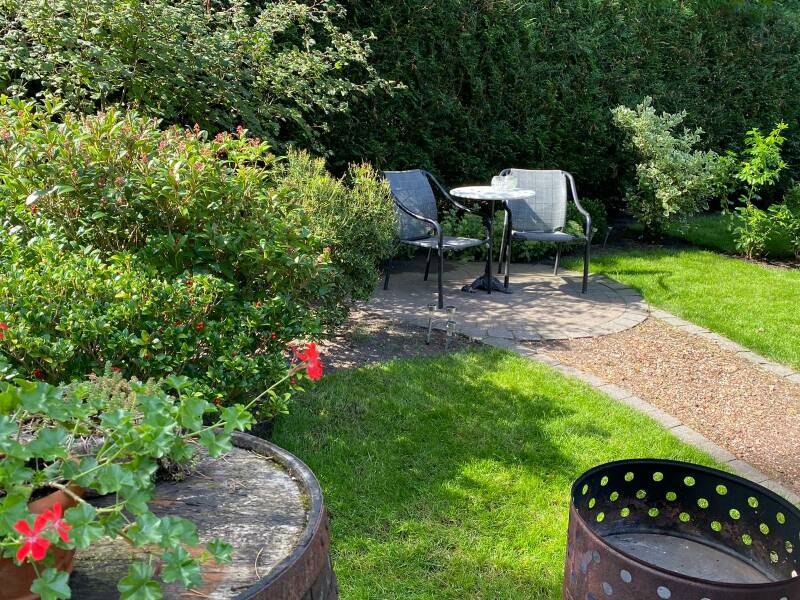 Achter zijde van het huisje is een ruim terras met tafel voor 6 personen. Er zijn nog 2 kleinere terrassen voor 2 en 4 personen rondom het huis zodat er altijd in zon of in schaduw gezeten kan worden.